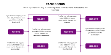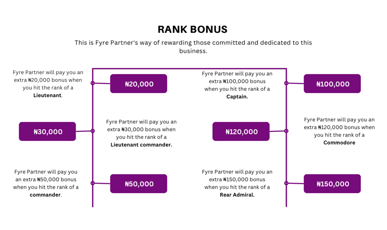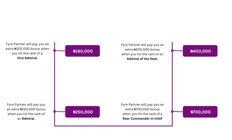 Captain: Total commission of ₦1,000,000 promotes to the rank of Captain with a bonus of ₦100,000.